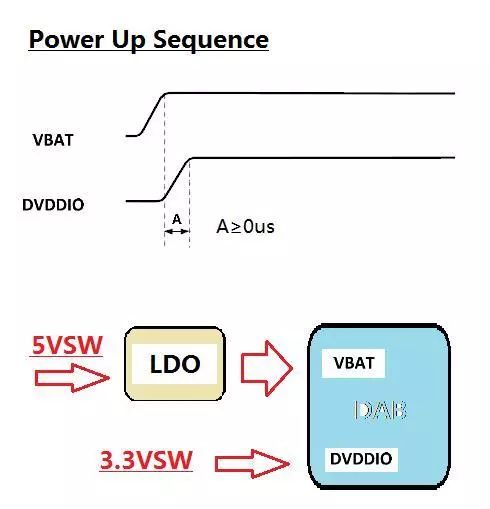 首先,要鎖定導致問題的模塊。我們先確認DAB上電時序,如圖3所示,DAB芯片對上電時序有要求,即接口電源DVDDIO一定要在主電源VBAT之后上電。可是,我們測試后發現DVDDIO提前于VBAT上電,進而導致DAB通信異常。導致DAB通信異常的原因找到了,但是,究竟為何上電時序會不滿足?
