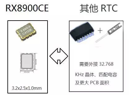 RX8900系列RTC相比其他時(shí)鐘模塊具有獨(dú)有的優(yōu)勢,該模塊內(nèi)部嵌入的了32.768kHz的晶體單元并采用了數(shù)字溫度補(bǔ)償震蕩技術(shù)(DT CXO)。這使得芯片在-40至+85°C溫度范圍內(nèi)達(dá)到了±3.4至±5ppm的高精度。同時(shí)不同于其他實(shí)時(shí)時(shí)鐘,RX8900系列RTC的內(nèi)嵌晶體單元使得產(chǎn)品不用外接晶體模塊,這極大的節(jié)省了有限的電路板資源也減少了系統(tǒng)設(shè)計(jì)的難度。