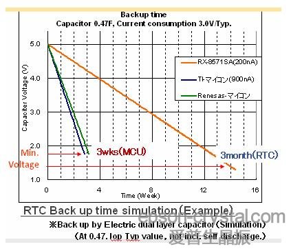 0.47F電容作為后備電源供電的情況下,MCU內置RTC可支持工作3周,而RX-8010SJ可以支持工作3個月時間,具有更持久的斷電續航能力。