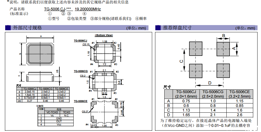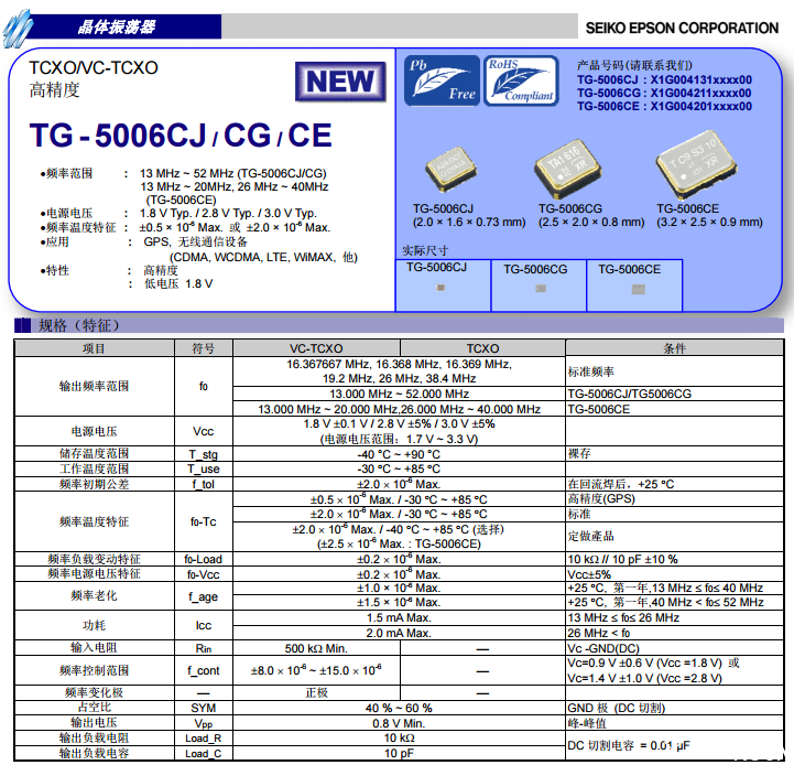 今天給大家介紹TG-5006系列:TG-5006CJ,TG-5006CG,TG-5006CE。精密的時間是現代通信、導航定位以及計算機自動控制的關鍵和核心,目前主流應用都是采用TCXO溫補晶振來提供。高精度晶振廠商愛普生晶振新推出超小型溫補晶振TG-5006系列TG-5006CJ,TG-5006CG,TG-5006CE。其中每個型號都對應3種版本:VC-TCXO、TCXO和TCXO(具待機功能),可滿足多樣化的用戶需求。低功耗、頻率穩定、小型化的優點讓其適合應用于GPS設計、射頻和無線通信設備(CDMA、WCDMA、LTE、WiMAX)等有高精度和高可靠性要求的設備。TG-5006根據型號的不同具有不同的輸出頻率范圍,其中TG-5006CJ,TG-5006CG的輸出頻率范圍為13~52MHz,TG-5006CE的輸出頻率范圍為13~20MHz,26~40MHz,多種頻率輸出為用戶的設計提供了更加靈活的選擇,那么TG-5006CJ,TG-5006CG,TG-5006CE三種型號該如何識別,三個型號規格參數又有什么區別呢?南山電子幫你具體來分析下,首先我們來看規格書:
