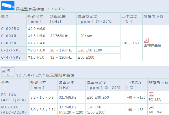 我們在電子市場里,最常聽到的晶振頻率就是32.768KHz,其實32.768K貼片晶振在日常生活中確實不可或缺。主要是因為32.768K貼片晶振比較容易分頻以便于產生1秒的時鐘頻率,因為32768等于2的15次方。我們每天用的手機,手表,電腦上顯示作用的鐘就是由它演變過來的。32.768K貼片晶振晶體主要被使用在各種時間顯示的計時電路中,因此也常常被稱為表晶或者鐘振。其中無源的晶體諧振器因其相對低廉的價格,使用最為廣泛,因為其切割方式,也被稱為音叉晶振。愛普生的表晶鐘振在全球市場具有重要市場地位,愛普生晶振32.768K貼片晶振,MHZ以及GHZ上都有重大突破,并且以32.768K貼片晶振享譽晶振行業32.768K的神奇在于它對時鐘的控制性能,精密度越高的表晶對時間控制的越精準,32.768K晶體分為貼片式和直插式,不同的電子產品使用的晶體也不一樣,直插式我們最常見的就是2X6和3X8系列的,32.768K貼片晶振就有很多種了,貼片系列的性能要比直插式的好很多,作為愛普生晶振官方授權中國區核心代理商,南山電子為大家精心整理了32.768K貼片晶振全系列規格和型號表,如下圖所示: